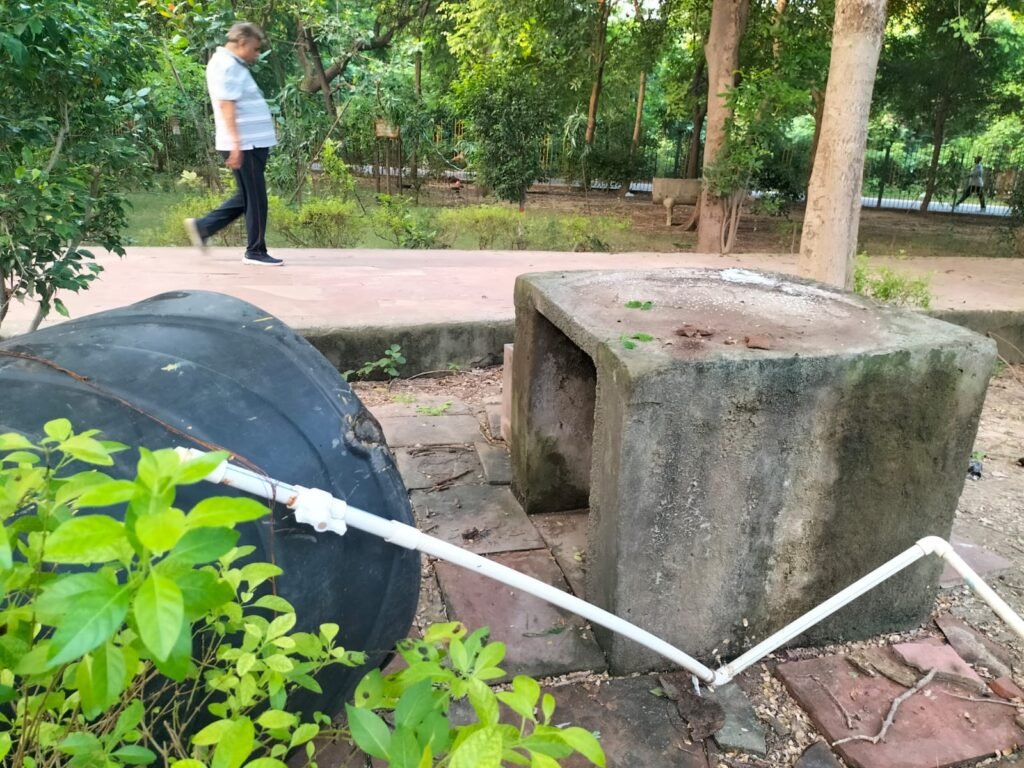 ईको क्लब के सदस्य एवं पर्यावरण प्रहरी प्रदीप खंडेलवाल ने बताया कि पूर्व विधायक स्वर्गीय श्री जगन प्रसाद गर्ग द्वारा विधायक निधि से स्थापित सबमर्सिबल से लगी टंकी जिससे सभी भ्रमण कारी पेयजल भी पीते हैं और पेड़ पौधों की सिंचाई भी प्रातः बेला में हो जाती है, टंकी गिरी पड़ी है। संभवतः टंकी खाली रही क्योंकि सबमर्सिबल का विद्युत संयोजन अज्ञात कारणों से विगत एक माह से काट दिया गया है।