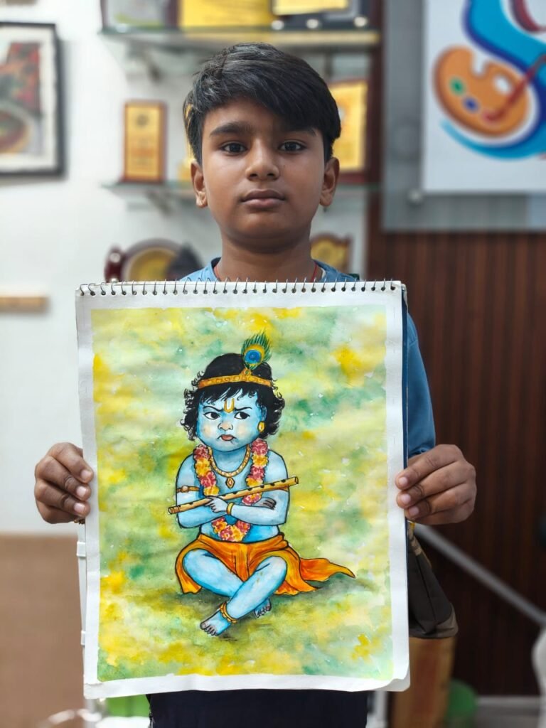 43 बच्चों द्वारा चित्र बनाये गए हैं, इन चित्रों में कृष्ण हंस रहे हैं, माखन खा रहे हैं, मुस्कुरा रहे हैं, नाच रहे हैं, रूठ रहे हैं, खेल रहे हैं, यशोदा के लाड का लुफ्त उठा रहे हैं, खेल रहे हैं, खा रहे हैं, खिला रहे हैं, मटक रहे हैं, लटक रहे हैं, ठुमक रहे हैं, माखन लीला कर रहे हैं, ऐसे कृष्ण के अनेक अनेक रूप प्रदर्शित हो रहे हैं।