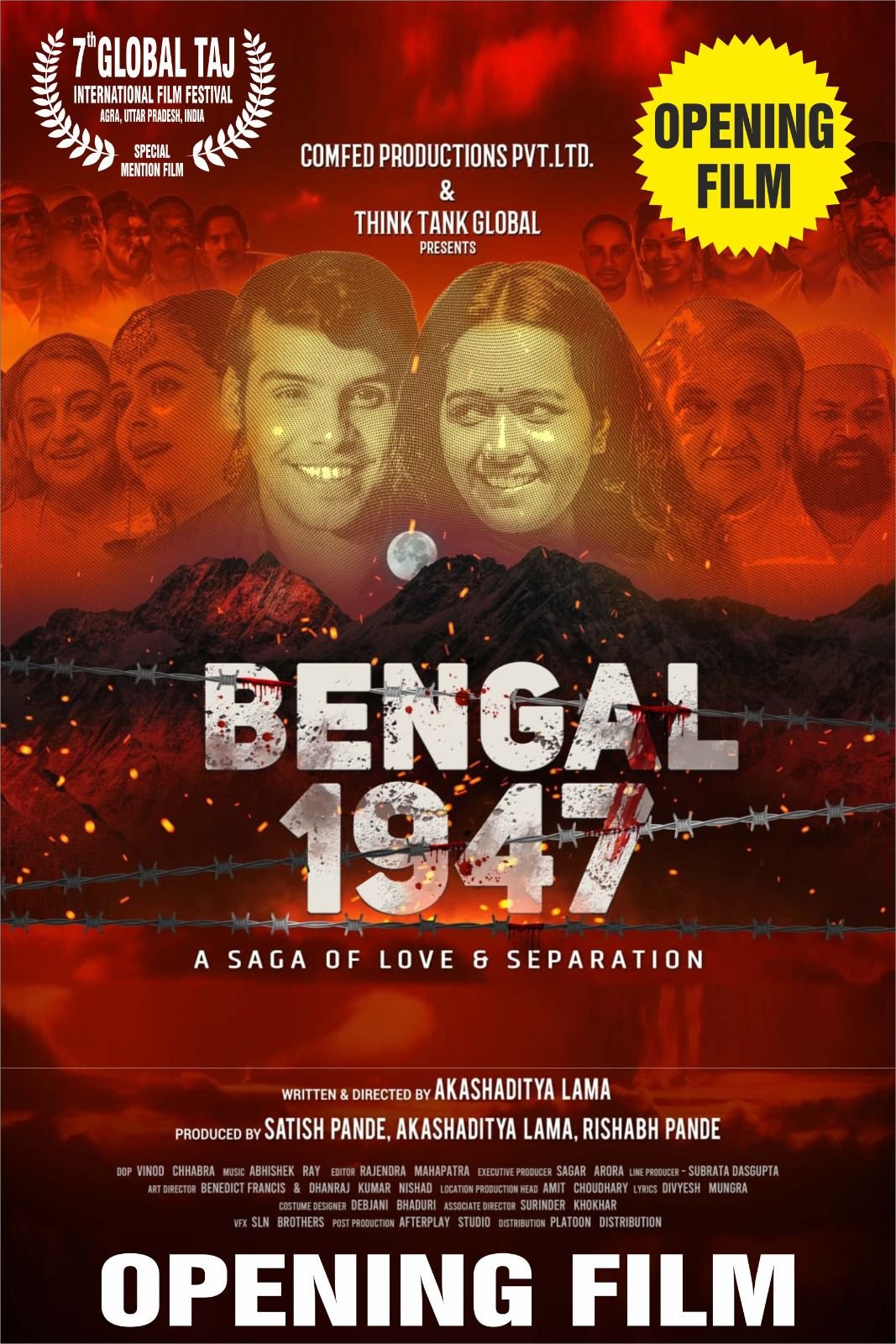 इस वर्ष खंदारी स्थित जे पी सभागार में दोपहर 2.30 बजे उद्घाटन सत्र के बाद ओपनिंग फ़िल्म “बंगाल 1947″ का प्रीव्यू होगा। ओपनिंग फ़िल्म “बंगाल 1947“ मुंबई के ख्याति प्राप्त लेखक निर्देशक हैं आकाशादित्य लामा और निर्माता हैं सतीश पांडे, आकाशादित्य लामा तथा ऋषभ पांडे।