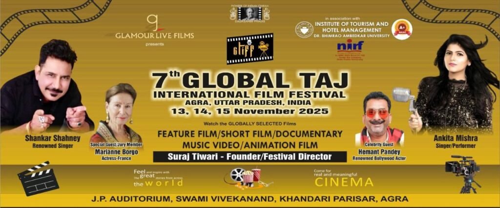 तीन दिवसीय 7th. ग्लोबल ताज इंटरनेशनल फिल्म फेस्टिवल का आयोजन कल 13 नवंबर 2025 से आरम्भ होने जा रहा है। संयोजक फ़िल्म निर्माता निर्देशक सूरज तिवारी ने बताया हर वर्ष की भांति आयोजित होने वाले फ़िल्म फेस्टिवल में देश भर के नामचीन निर्माता निर्देशक की लघु फिल्मों का प्रदर्शन होता है।