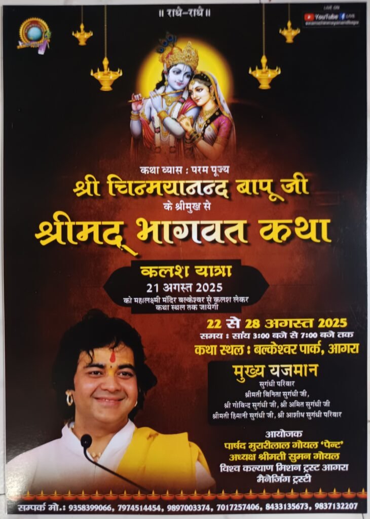 विश्व कल्याण मिशन ट्रस्ट की आगरा इकाई के तत्वावधान में जन्माष्टमी के उपरांत नंदोत्सव के पावन अवसर पर विश्व शांति, जन कल्याण एवं मानव सेवा को समर्पित श्रीमद् भागवत कथा का दिव्य आयोजन बल्केश्वर पार्क में 22 से 28 अगस्त तक आयोजित किया जाएगा।