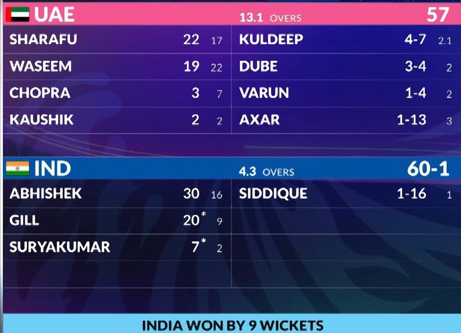 भारत का पहला विकेट चौथे ओवर में 48 रन पर गिरा। अभिषेक शर्मा ने 16 गेंद में 30 रन बनाए। वहीं शुभमन गिल ने 9 गेंद में नाबाद 20 रन और कप्तान सूर्य कुमार यादव ने 7 रन बनाकर मैच जीत लिया। भारत ने संयुक्त अरब अमीरात को 9 विकेट से हराकर शानदार शुरुआत की है। कुलदीप यादव मैन ऑफ द मैच रहे।