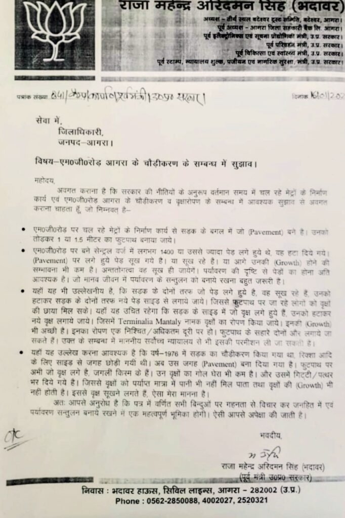 आमजन और शहर के हित में लगातार विभिन्न मुद्दों को उठाने वाले वरिष्ठ भाजपा नेता और उत्तर प्रदेश सरकार में चार बार कैबिनेट मंत्री रहे राजा अरिदमन सिंह ने आगरा के जिलाधिकारी को पत्र देकर महात्मा गाँधी मार्ग के चौड़ीकरण और उसके साथ ही पर्यावरण संतुलन की दृष्टि से वृक्षारोपण की माँग की है।